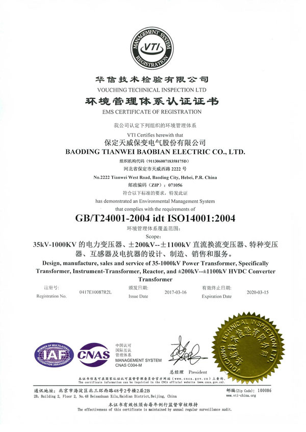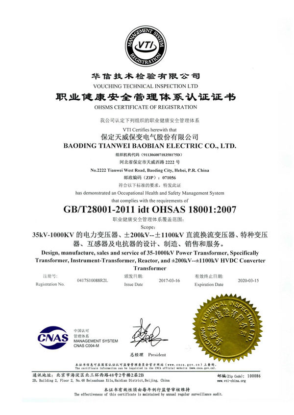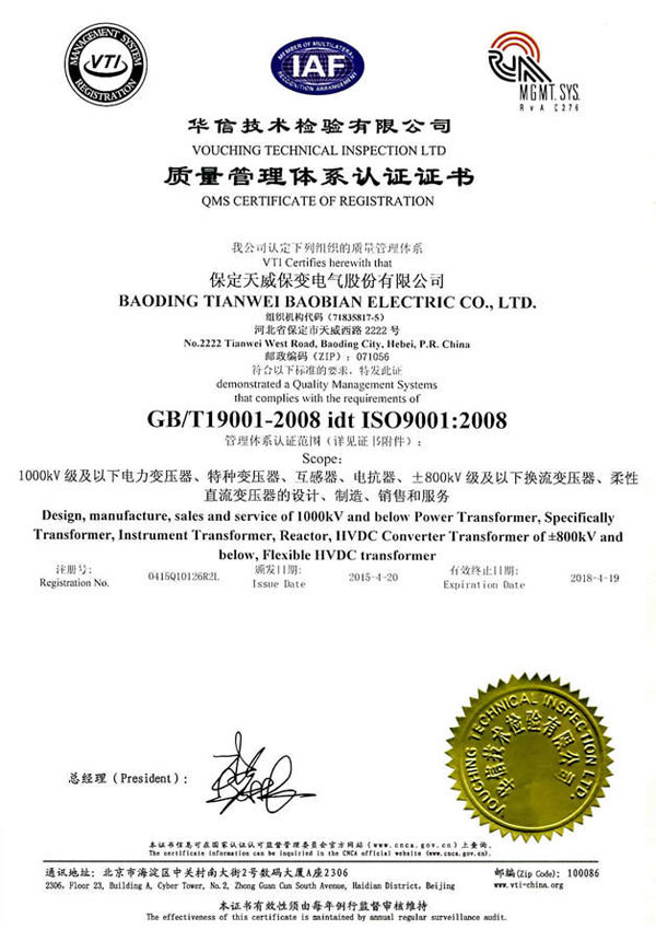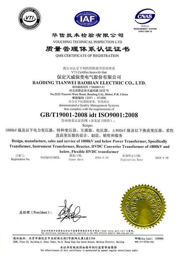 保变电气公司建立并实施规范的质量管理体系,于1996年取得了iso 9001:1994质量体系认证证书;2003年通过转版实现了iso9001:2000质量管理体系认证。2004年、2007年两获河北省质量管理奖,2005年获国家出口免验证书,通过国家实验室认证。2006年通过国家产品认证并被中国工业经济联合会评定为中国变压器、整流器、互感器制造行业排头兵企业。2010年通过了iso9001:2008转版质量管理体系认证。