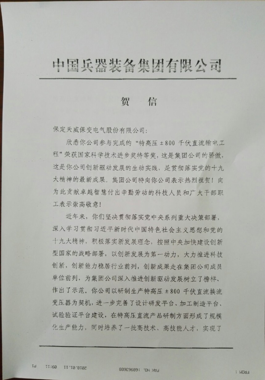 1月8日,国家科学技术奖励大会在北京隆重召开,对获得2017年度国家科学技术奖的项目和人员进行表彰。保变电气参与建设的 “特高压±800千伏直流输电工程”项目获国家科学技术进步奖特等奖。这是保变电气继“特高压交流输电关键技术、成套设备及工程应用”获得2012年度国家科技进步奖特等奖后,再次获得国家科技奖最高荣誉。兵器装备集团向我公司发来贺信表示祝贺!