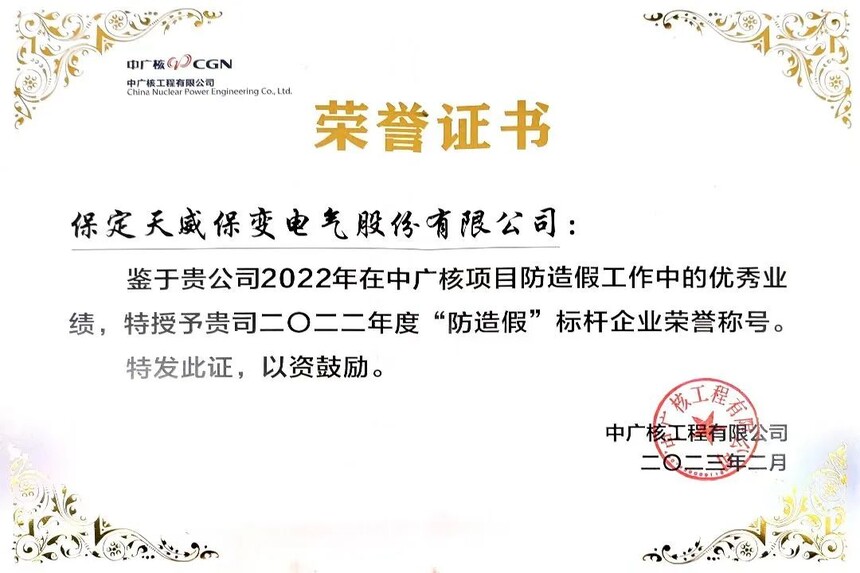 近日,保变电气喜获中广核工程有限公司2022年度防造假标杆企业ag尊龙凯时的荣誉证书。此次证书的取得彰显了核电用户对保变电气在质保体系能力、诚信经营、防造假建设、符合性核查方面的高度认可。保变电气为2022年获此荣誉的8家企业之一,为电气板块获此荣誉的独家企业。