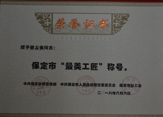 2017年7月,保定市委宣传部、市国资委、保定市总工会共同在全市开展了“最美工匠”推选展示活动。经过组织推荐、集中展示、群众投票、专家评议、社会公示等环节,最终戚红、储志强等10名同志被授予“最美工匠”称号。
