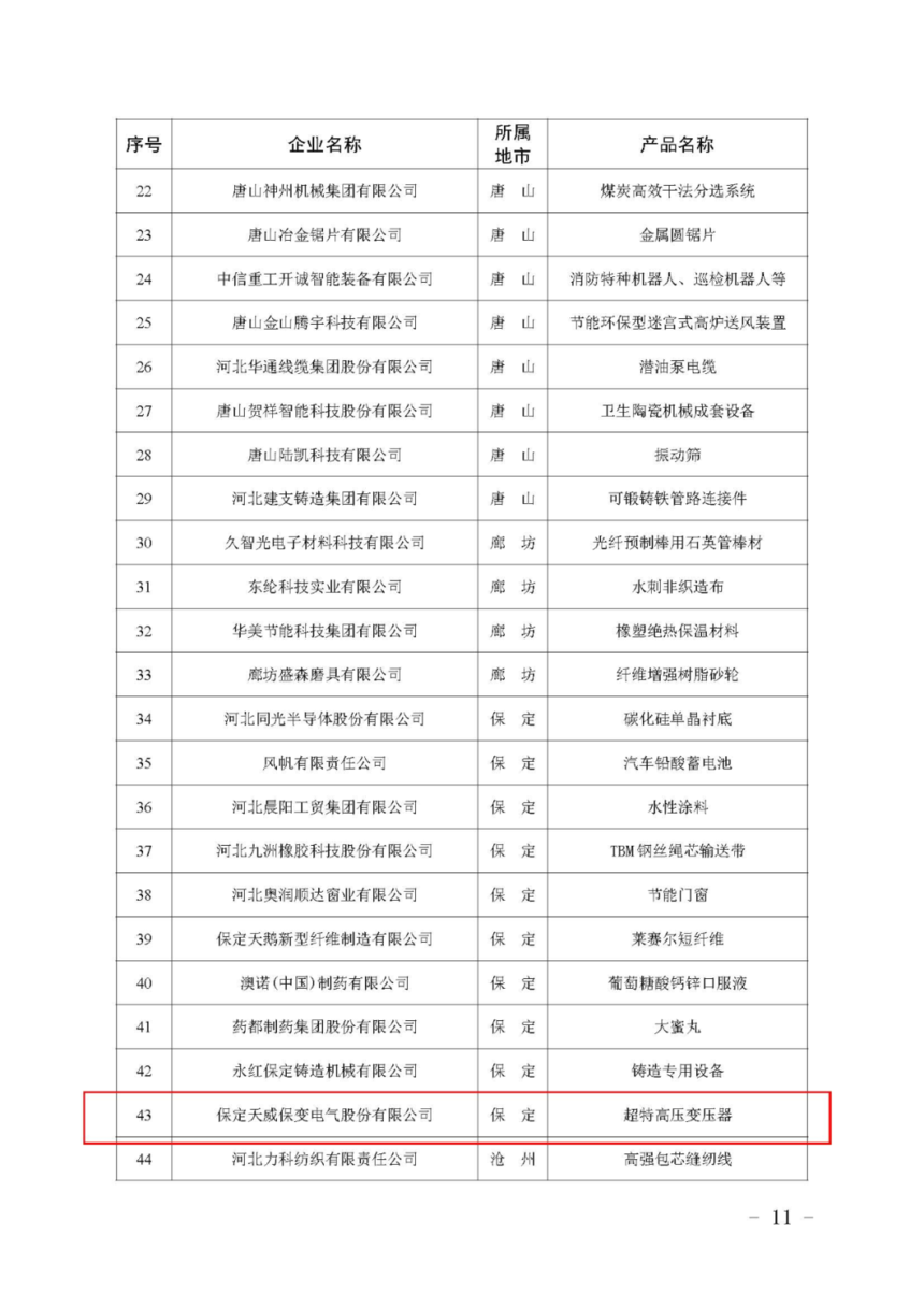 近日,河北省工业和信息化厅公布了《第五批河北省制造业单项冠军及通过复核的第一批、第二批省级制造业单项冠军企业(产品)名单》,保定天威保变电气股份有限公司顺利通过河北省制造业单项冠军企业复评。
